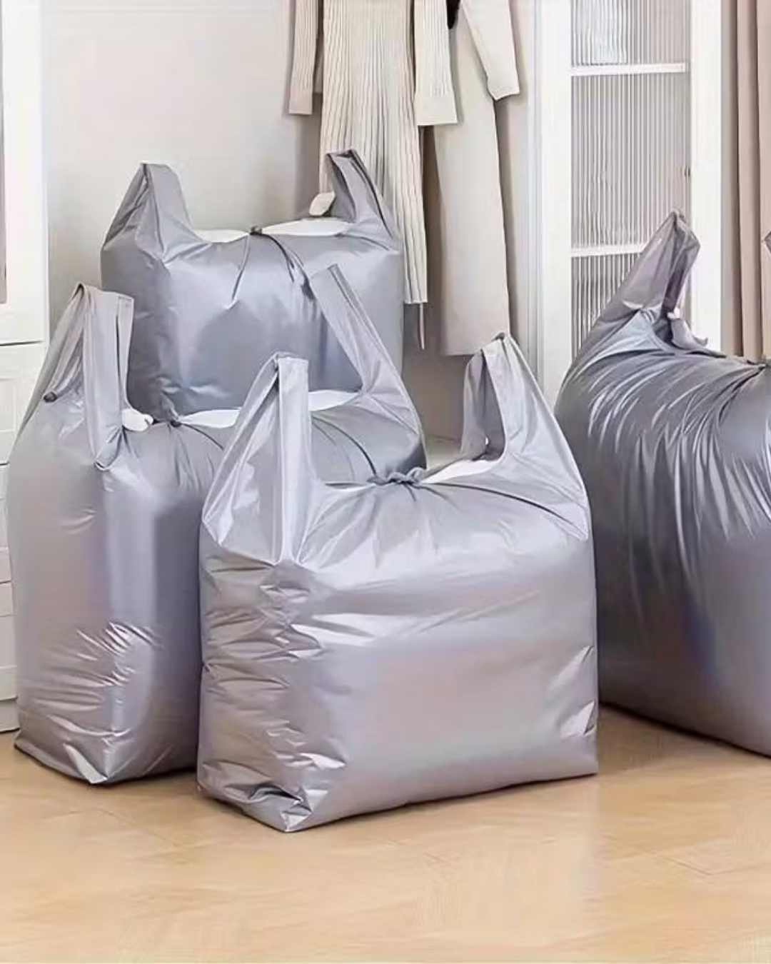 • Yuqori Sifat va Chidamlilik: Yaltiroq kumush rangli, mustahkam polietilen materialdan tayyorlangan. Bu sumkalar og’ir xaridlarga dosh berish uchun mo’ljallangan, shuningdek, yirtilishga chidamli.